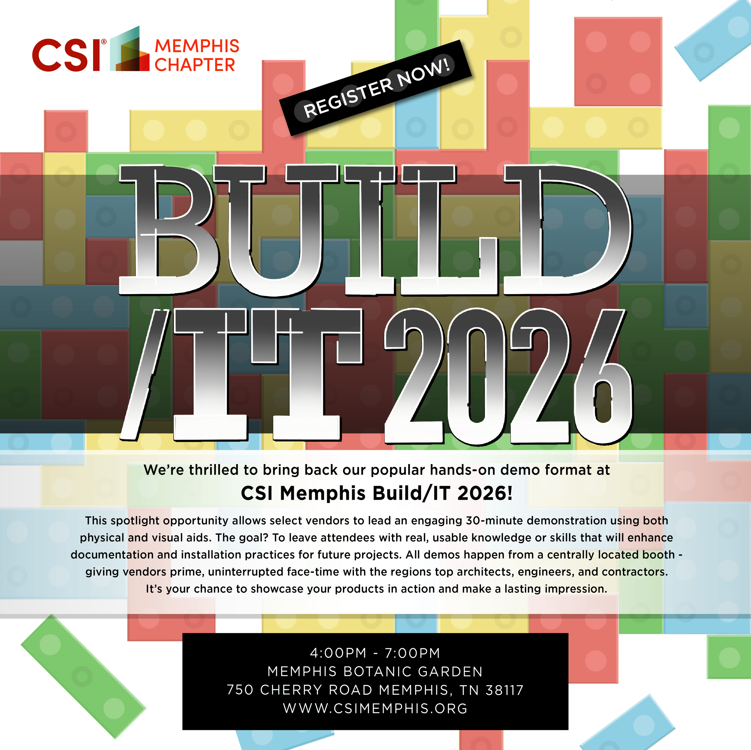 CSI Memphis is gearing up for BUILD/IT 2026. See options below to reserve your booth and sponsorship today. The BUILD/IT planning committee will be assigning spaces for vendors based on the size and level of booth they reserve. Our team expects spaces to fill up quickly, reserve your spot today!